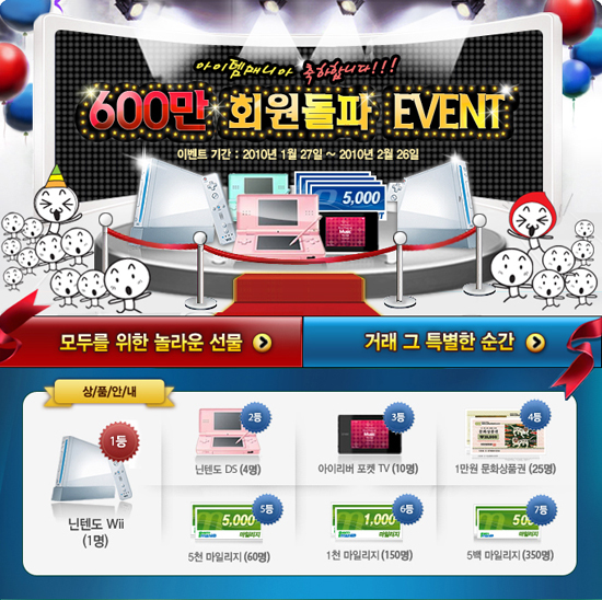 IMI는 자사의 토털 게임엔터테인먼트 포털인 ‘아이템매니아(www.itemmania.com)’의 600만 회원 돌파 기념 이벤트를 1월 27일(수)부터 2월 26일(금)까지 진행한다. 이번 이벤트는 크게 네 가지로 나뉘어지며, 총 30일간 1,800명에게 경품을 선사할 예정이다.