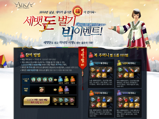 한빛소프트의 1000 vs 1000 초대형 전쟁 MMORPG ‘에이카 온라인(http://aika.hanbiton.com)’이 설을 맞이해 오는 2월 9일부터 23일까지 ‘에이카, 2010년 설날 세뱃돈 쏜다!’ 이벤트를 실시한다.