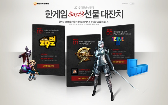 한게임은 이벤트 기간동안 `C9`, `Z9별`, `테트리스`를 처음으로 접하는 이들 전원에게 게임 내에서 유용하게 활용할 수 있는 아이템을 지급하고, 추첨을 통해 2010명에게 노트북, 무선 키보드/마우스 세트를 비롯한 다양한 선물을 선사하는 등 게이머들에게 경인년의 특별한 기억을 안겨줄 예정이다.