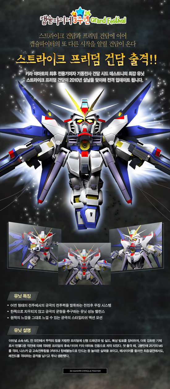 넷마블을 서비스하는 CJ인터넷의 권영식 상무는 “서비스 3주년을 맞는 `SD건담 캡슐파이터`에 그 동안 보내주신 애정에 감사드리는 의미로 세 번 SS랭크 유닛인 ‘스트라이크 프리덤 건담’을 업데이트하고 ‘3주년 그랜드 페스티벌’을 진행하게 됐다”며, “깜짝 선물이 제공되는 레어 캡슐 이벤트와 윷놀이 이벤트 외에도 더 풍성한 이벤트를 계획하고 있으니 많은 관심 부탁드린다”고 말했다.