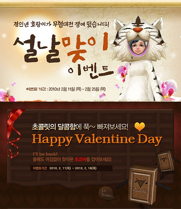또한 ‘설날맞이 이벤트’는 오는 2월 11일부터 2월 25일까지 진행되며 총 3가지 이벤트를 통해 풍성한 설을 맞이할 수 있다. 첫 번째는 경인년 호랑이해를 기념해 ‘찬스! 호랑이 의복을 잡아라!’라는 이벤트이고, 두 번째는 ‘전 서버 경험치 50% 추가!’, 세 번째는 ‘2010년에도 만원의 행복’ 등 3색 이벤트다.