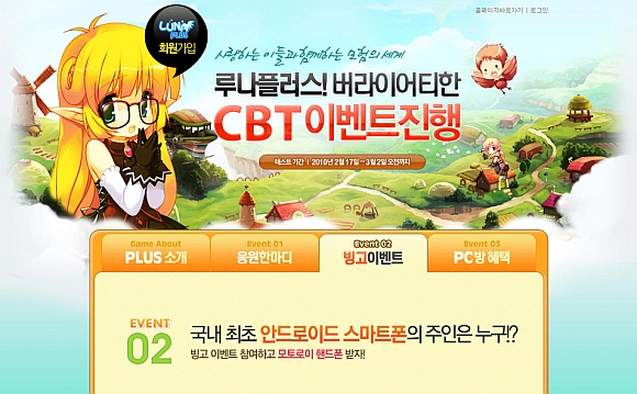 한편 이번 CBT 이벤트로 국내 최초 안드로이드 스마트폰, 백화점 상품권, 해피머니 상품권, 도너츠 교환권, 싸이월드 BGM 10곡 등을 받을 수 있는 ‘빙고 이벤트’와 CBT 참여 유저가 PC방에서 게임을 플레이 할 경우 매일매일 색다른 아이템을 100% 지급하는 요일별 PC방 아이템 지급, 접속 인원별 PC방 버프 부여, 요일별 PC방 버프 부여, PC방 포인트로 아이템을 구입할 수 있는 PC방 포인트 등 대박에 가까운 다채로운 ‘PC방 혜택 이벤트’가 진행된다.