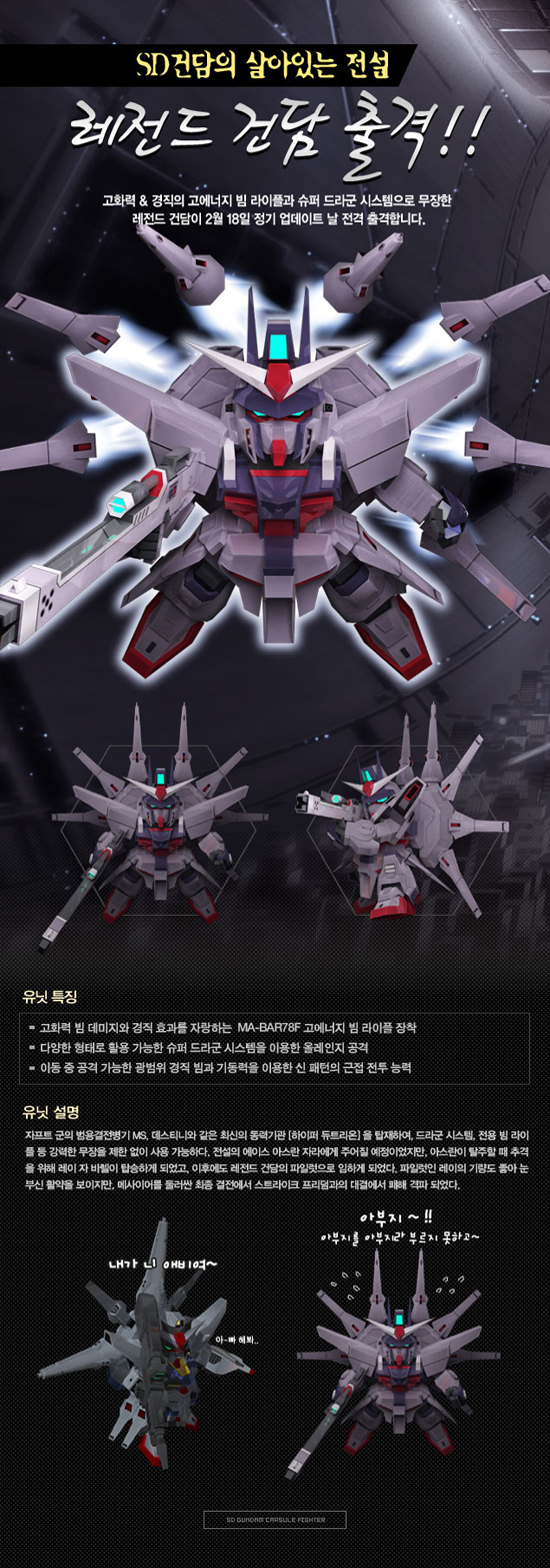 게임포털 넷마블이 서비스하고 반다이코리아가 기획, 소프트맥스에서 개발한 액션대전 게임 `SD건담 캡슐파이터`가 2월 정기 업데이트로 S랭크 유닛 ‘레전드 건담’을 추가한다.