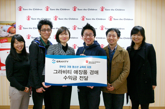 경매 수익금은 행사에 참여한 그라비티 직원들이 직접 세이브더칠드런을 방문해 전달했다. 이 수익금은 2010년 세이브더칠드런에서 진행 중인 ‘한 생명 살리기, 나란히 결연’ 활동의 일환으로 생계에 어려움을 겪고 있는 한부모 가정 청소년의 학업 보조를 위한 교육비로 1년간 지원될 예정이다.
