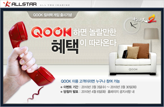 ‘QOOK 컬처팩’은 쿡(QOOK) 상품(인터넷, TV, 집전화, 인터넷전화)을 이용하는 고객들이 도서, 뮤직, 게임까지 누릴 수 있는 쿡 만의 차별화된 생활밀착형 제휴 서비스로, 이번 론칭과 함께 `십이지천2`를 처음으로 게임에 대한 서비스를 선보인다.