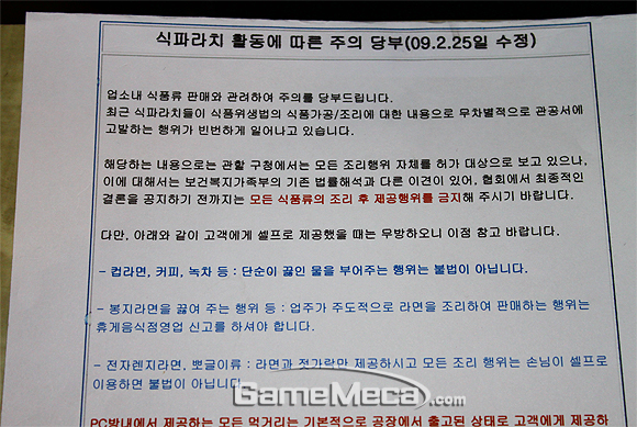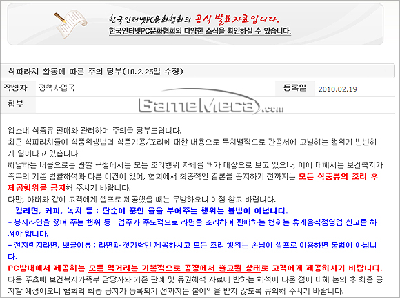 PC방에서 제공하는 모든 식품 류의 조리 제공 행위를 금지하라는 내용이었다. 이유인 즉, 현재 PC방에서 경쟁력으로 시행하고 있는 음식조리 행위는 식품위생법을 위반하는 것으로 신고가 접수되면 3년 이하의 징역 또는 3천만원 이하의 벌금형에 처해질 수 있다는 것이다. 단, 컵라면이나 커피, 녹차 등 끓인 물을 부어주는 행위는 불법이 아니며 전자레지 라면이나 뽀글이류는 ‘셀프’로 변경해야 피해를 면할 수 있다. 이는 식품위행법 시행령 21조를 8항을 예를 들며 구체적으로 제시했다. 또, 이 같은 내용도 최종 결정된 사항이 아니며 현재 보건복지부와 협의를 진행하고 있어 최종 사항이 나오기 전까지의 일종의 선결조치라고 설명했다.