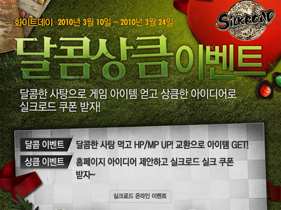10일 조이맥스는 다가오는 화이트데이를 맞아 자사가 개발하고 서비스하는 3D MORPG `실크로드 온라인`의 <화이트데이 달콤한 사탕 이벤트>와 <화이트데이 상큼한 홈페이지 아이디어 제안 이벤트>를 진행한다고 밝혔다.