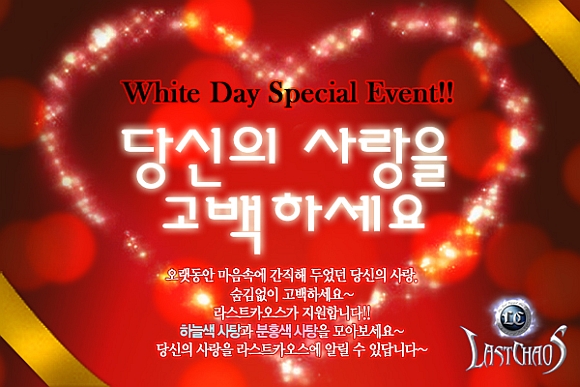 25일까지 진행되는 라스트카오스의 화이트데이 이벤트는 오랜 기간 간직해 온 사랑의 마음을 공개적으로 알릴 수 있는 기회를 제공한다. 게임 속 몬스터 사냥 시 나오는 사탕을 통해 얻을 수 있는 편지지에 메시지를 남기면, 게임에 접속한 모든 사람에게 자신의 고백이 전해지는 것.