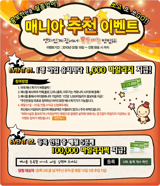 이번 이벤트는 ‘아이템매니아’ 회원들이 자신의 블로그, 미니홈피 등을 통해 ‘아이템매니아’를 알리고 마일리지를 받는 이벤트다. 참가를 원하는 사람은 ‘아이템매니아’의 배너를 자신이 가입한 카페, 블로그, 미니홈피 등 커뮤니티에 퍼 가면 되고, 다른 사람이 이 배너를 통해 ‘아이템매니아’에 가입하면 이벤트 참여자에게 1천 아이템매니아 마일리지를 지급한다.