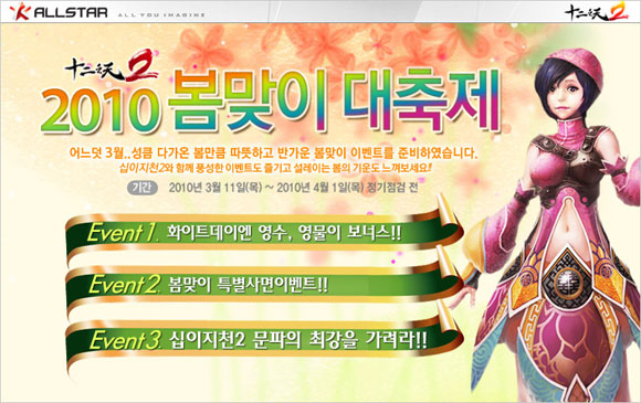KTH ‘올스타’는 자사에서 서비스 중인 `십이지천2`가 따뜻한 봄을 맞아 2010 ‘봄맞이 대축제’ 이벤트를 실시한다고 밝혔다.
