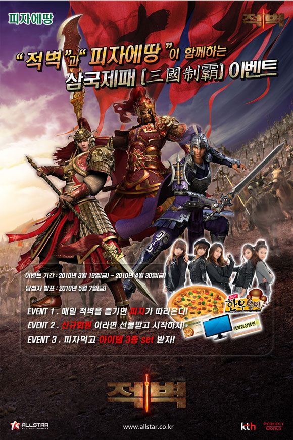 KTH ‘올스타’는 국가대전 RPG `적벽`이 국내 피자 브랜드 ‘피자에땅’과 공동 이벤트를 진행한다고 금일(22일) 밝혔다.