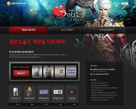 우선 4월 4일까지 진행되는 행운의 잭팟 이벤트에서는 모든 유저들에게 매일 첫 로그인 시 5개의 코인을 증정, 코인 개수만큼 행운을 터트릴 수 있는 기회를 제공하며, 이벤트 참여 결과에 따라 디지털 카메라, 영화 예매권, 세븐소울즈 로고가 들어간 후드티 등 푸짐한 경품을 증정한다.