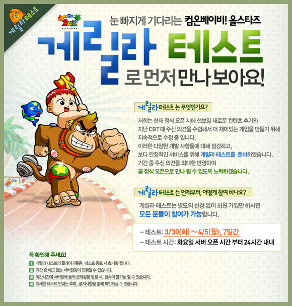 ‘컴온베이비! 올스타즈’ 게릴라 테스트는 기간내 회원가입만 하면 누구나 참여 가능한 방식으로 3월 30일부터 4월 5일까지 진행되며, 테스트 기간 동안 일정 계급을 달성하면 오픈베타테스트 때까지 캐릭터 명을 유지시킬 수 있는 ‘캐릭터명 선점 이벤트’도 실시한다.
