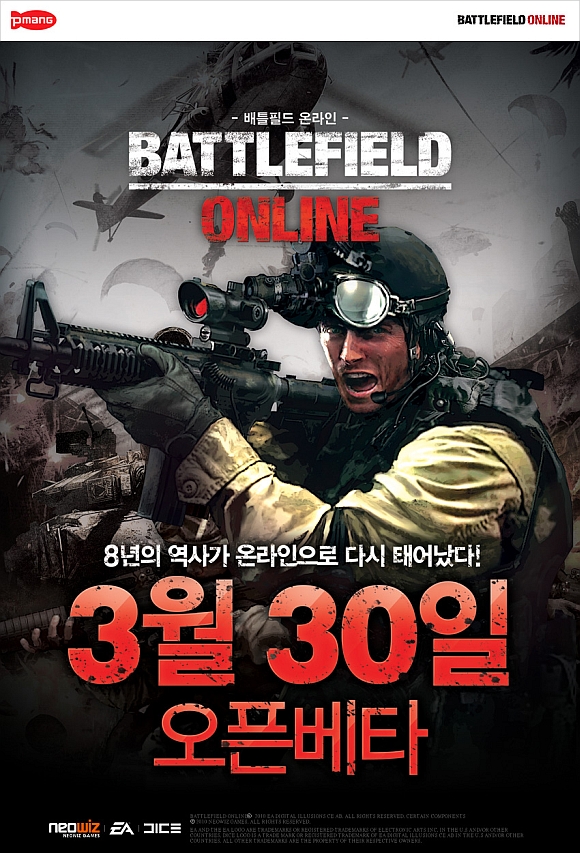 네오위즈게임즈는 일렉트로닉아츠와 공동 개발 중인 대규모 전장 FPS ‘배틀필드 온라인(Battlefield Online)’이 게임포털 피망을 통해 30일부터 공개 서비스에 돌입한다고 밝혔다.