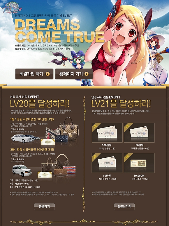 여성 유저 이벤트는 게임을 진행해 20레벨 이상을 달성 한 후 홈페이지의 게시판에 미션 완료의 글과 이미지를 올리면 자동으로 응모가 된다. 1등 이벤트 당첨자에게는 5백만 원의 명품 쇼핑이용권이 지급되며, 쇼핑을 위한 최고급 차량이 지원된다. 최고의 명차로 알려진 마이바흐 또는 롤스로이스 펜텀 차량으로 쇼핑을 위한 에스코트 서비스를 통해 오프라인을 통한 최고의 하루를 만끽할 수 있도록 준비하고 있다.