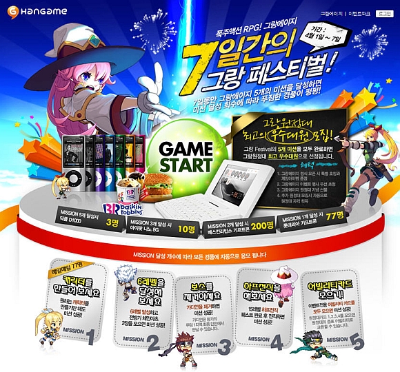 이와 함께, 달성한 미션수에 따라 전자사전, MP3, 베스킨라빈스 상품권, 롯데리아 기프트콘 등 다양한 상품을 총 900명에게 증정하는 특별 이벤트를 진행하며 모든 미션을 수행한 유저를 ‘우수 그랑원정대원’으로 선정해 게임이 정식 오픈 하면, 특별 호칭과 게임 아이템을 제공할 뿐만 아니라, <그랑에이지> 이벤트 행사에 우선 초청하는 등 차별화된 혜택을 선사할 계획이다.