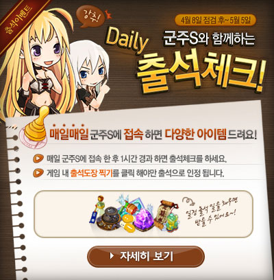 매일매일 군주스페셜에 접속하면 다양한 행운이 쏟아지는 이번 이벤트는 접속 후 1시간이 지나면 게임화면에 생성된 ‘출석확인’버튼을 클릭해 출석을 체크할 수 있으며 달성 일마다 다양한 보상을 받을 수 있다.