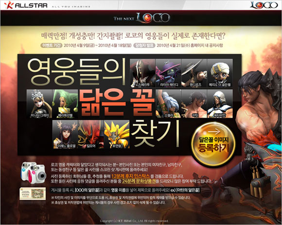 이번 이벤트는 오늘 9일(금)부터 18일(일)까지 열흘 동안 열리며, 아틴, 스텔라, 옥타비안 등 ‘로코(LOCO)’의 12명 영웅 캐릭터와 닮았다고 생각되는 유저 본인의 사진이나 동성 및 이성 친구의 사진을 ‘로코(LOCO)’ 홈페이지의 스크린 샷 게시판에 올리는 방식으로 진행된다.