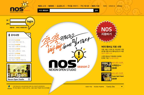 인재 발굴 및 양성과 신규 사업 지원을 목적으로 고안된 `넥슨 오픈 스튜디오 (Nexon Open Studio: 약자 NOS)’에는 참신한 아이디어와 재능을 가진 대학생 및 19세 이상 일반인이라면 누구나 참가 가능하다.