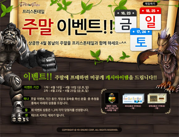 프리스톤테일이 주말 접속만 하면 경품을 제공하는 이벤트를 실시한다. 와이디온라인이 개발한 액션 MMORPG 프리스톤테일은 ‘주말 접속 이벤트’를 실시한다.