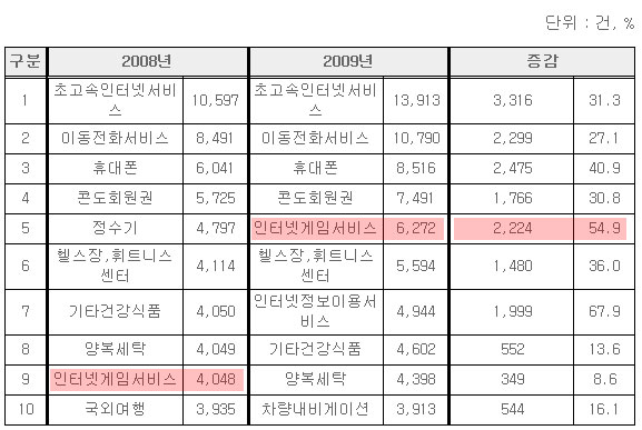 `인터넷 게임 서비스`는 2008년 4,048건에서 2009년 6,272건으로 전년 대비 54.9% 상승해 인터넷 정보이용 서비스에 이어 소비자 불만 접수가 두 번째로 많이 상승한 품목이다.