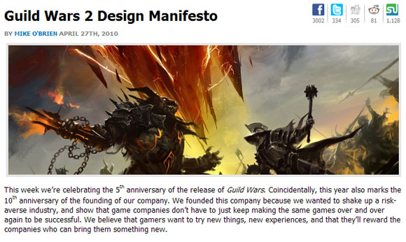 현지 시간으로 27일, 엔씨소프트의 시애틀 소재 스튜디오인 아레나넷의 총괄 마이크 오브라이언(Mike O’Brien)이 ’길드워2’의 디자인 측면에서의 방향성 3 가지를 제시했다. 그는 훌륭한 RPG(역할수행게임)에서 느낄 수 있는 스토리, 자연스럽게 소셜 게임을 즐길 수 있는 협력 시스템, 그리고 게이머의 취향에 맞춰 커스터마이징이 가능한 전투 시스템을 강조하며 차별화된 MMORPG(다중접속역할수행게임)의 방향성을 밝혔다.