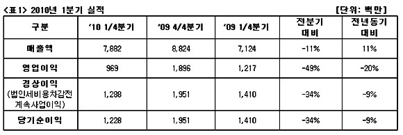 이는 최대 실적을 선보인 지난 4분기보다 매출액은 11%, 영업이익은 49%, 경상이익과 순이익은 각각 34% 줄어든 수치다.
