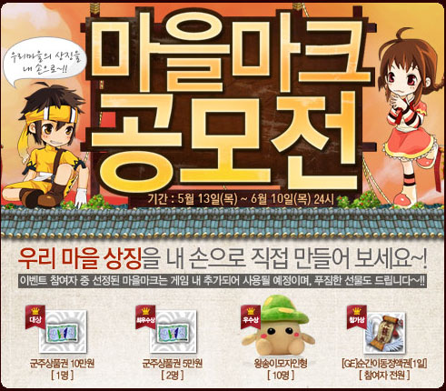 마을마크 공모전은 이벤트 기간 동안 마을 마크 포맷에 맞는 이미지를 제작해 컨셉, 상징 등의 공모작 관련 설명과 함께 군주 온라인 홈페이지에 응모하면 창의성, 어울림, 퀄리티 등 공정한 심사기준에 따라 보상을 지급하게 된다.