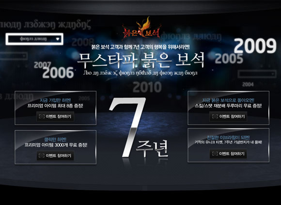`무스타파 붉은 보석`이라는 주제로 펼쳐지는 이번 이벤트는 신규 유저, 휴면 유저, 기존 유저 모두에게 다양한 유료 아이템을 제공한다. 특히, 게시판 이벤트를 통해 제공되는 777개의 ‘7주년 기념반지’는 붉은 보석 유저들이 7주년의 의미를 간직한 유니크 아이템을 획득할 수 있는 좋은 기회가 될 것이다.