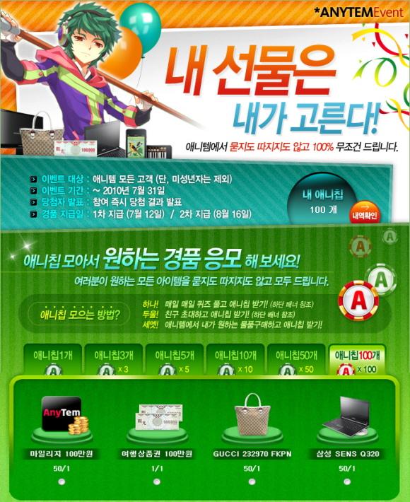 이번 이벤트는 회원가입 등을 통하여 획득한 `애니칩`으로 게임아이템, 노트북, 마일리지 등 받고 싶은 선물을 선택하면 당첨 여부를 즉석에서 알 수 있도록 구성되어 있다. `애니칩`은 퀴즈풀이, 친구 추천 등 다양한 방법으로 획득할 수 있다.