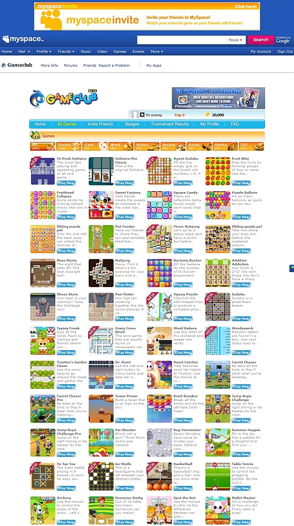 총 44종의 게임으로 구성된 소셜네트워크게임 ‘게임클럽’은 마이스페이스 내에 게임 어플리케이션으로 등록되었으며, 마이스페이스의 회원이면 누구나 이용할 수 있다.