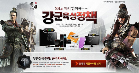 ▲이벤트 기간 중 신규 캐릭터를 생성해 25레벨을 달성한 이용자들과 ▲누적 공신점수 500점을 확보한 이용자를 추첨, 42인치 LED TV, 24인치 풀HD모니터, 외장하드, 서브 우퍼 스피커, 영화예매권을 증정하는 ‘승리의 기반, 신병육성책’과 ‘용맹의 대가, 전장포상책’ 이벤트가 준비 중이다.