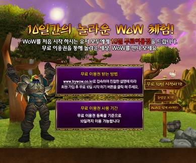 이번 ‘정말로 와우! 하고 싶니? 10일간의 WoW 체험’ 캠페인은 월드 오브 워크래프트 신규 회원 가입자에게 10일 무료 이용권을 증정하는 것으로 신규 유저는 베틀넷 계정을 생성하고 월드 오브 워크래프트 계정을 생성하면 프로모션 페이지(www.trywow.co.kr)에서 이용권을 받을 수 있다. 무료 이용권은 월드 오브 워크래프트 계정 생성 후 7일 이내에 사용이 가능하다.