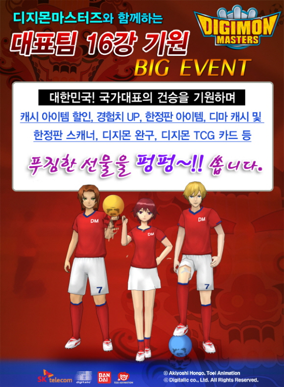 애니메이션 `디지몬`을 바탕으로 한 MMORPG `디지몬 마스터즈 온라인`이 대한민국 국가대표팀의 건승을 기원하는 다양한 이벤트를 진행한다고 밝혔다.