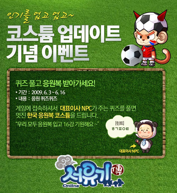 이외에도 `대항해시대`는 22일까지 홈페이지에서 진행하는 ‘축구공 차기 이벤트’를 통해 각종 게임 아이템을 증정하며, `서유기전`은 간단한 퀴즈를 통해 월드컵 응원 코스튬을 제공한다.