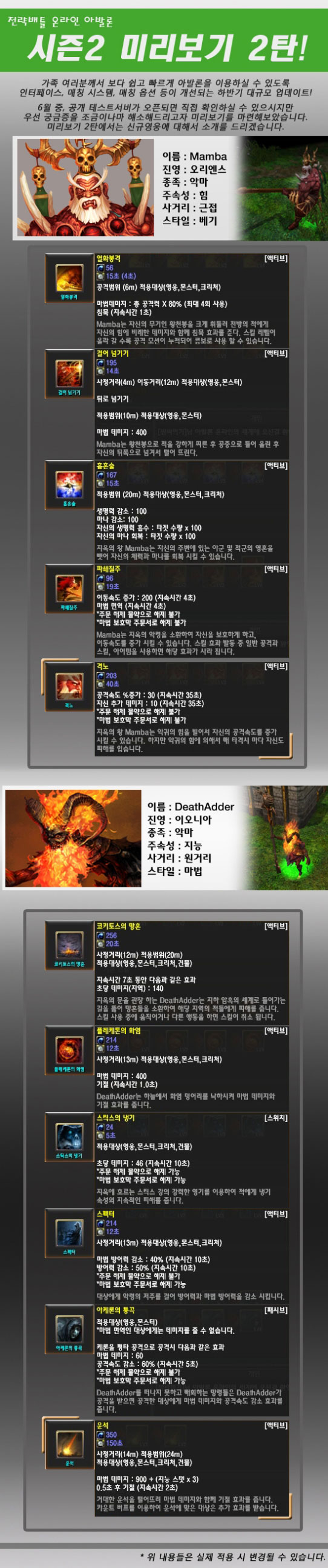 6월 9일 사전 공개되는 ‘시즌2’ 콘텐츠는 신규 영웅 2종으로, `아발론 온라인`과 제휴를 맺은 게이밍 주변기기 전문 업체 ‘Razer(레이저)’의 제품 모델명을 영웅화 한 ‘맘바’(Mamba)와 ‘데쓰애더’(Death Adder).