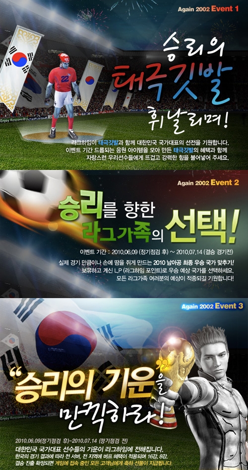 `라그하임`은 이번 이벤트의 표어를 ‘Again 2002’로 정하고, 2002년 월드컵의 영광과 열기를 다시 한번 일으키고자 하는 3가지의 승리 기원 이벤트를 9일부터 7월 14일까지 실시한다.
