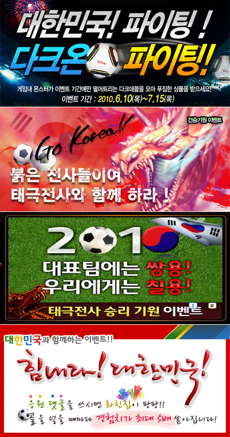 ‘다크온라인’에서도 여러 이벤트가 진행된다. ‘대한민국 파이팅, 다크에덴 파이팅’은 7월 15일(목)까지 게임 내에서 ‘다크데블 축구공’을 획득한 유저에게 게임에서 쓸 수 있는 다양한 보상 아이템을 주는 이벤트이다. 또 24일(목)까지 게임 내 ‘알림판’에 응원 메시지 남기고 이를 스크린샷으로 찍어 응모한 유저에게도 ‘경험의 돌’ 등 아이템을 증정한다. 우리나라가 16강, 8강, 4강에 진출할 경우에는 다음 날 게임에 접속한 모든 유저에게 ‘선물상자’ 아이템을 지급해 줄 예정이다.