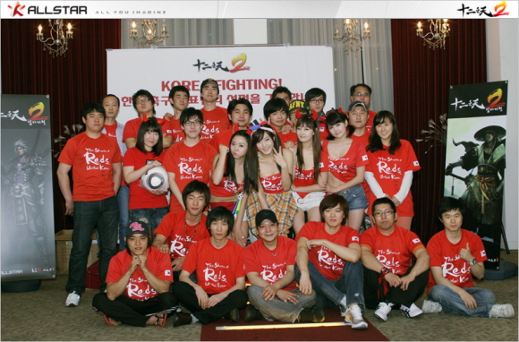 KTH ‘올스타’에서 서비스 중인 정통 성인 무협 RPG `십이지천2`가 17일 한국 대표팀의 아르헨티나전을 맞아 진행한 단체응원전이 성황리에 끝났다. 이번 응원전에는 `십이지천2`의 각 세력을 대표하는 인기 레이싱 모델 송아름(정파), 육지혜(사파), 한가은(마교), 최슬기(낭인)와 함께 진행되었다.