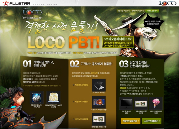 이와 함께 ‘로코’는 금일부터 23일까지 ‘격렬한 사전 몸풀기!’ 이벤트를 실시, Pre-OBT에 참가하는 유저들을 위해 특별한 혜택과 최신 넷북, 그래픽카드, 모니터 등 푸짐한 경품을 제공한다.