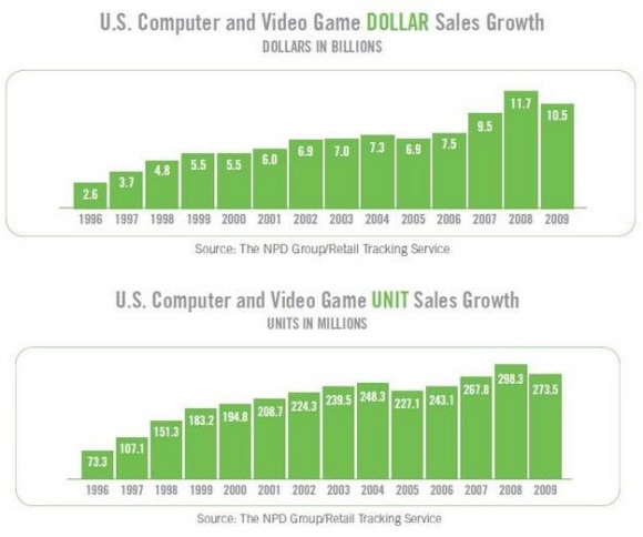 미국 게임협회 ESA가 발표한 2010 게임업계 백서 ‘에센셜 팩트 2010’에 따르면, 2009년 미국 게임시장의 소프트웨어 시장 규모는 전년대비 10% 가량 감소한 것으로 나타났다. 2009년 게임 소프트웨어 판매량은 2억 7350만장으로 2008년 3억 490만장에 비해 10.3% 줄어들었고, 총 매출액 또한 105억 달러(한화 약 12조 원)로 2008년 114억 달러(한화 약 13조 5천억 원)에 비해 8.3% 감소한 것으로 나타났다. 이 조사내용은 온라인 게임이나 다운로드 콘텐츠 판매량을 포함하지 않은 결과이다.