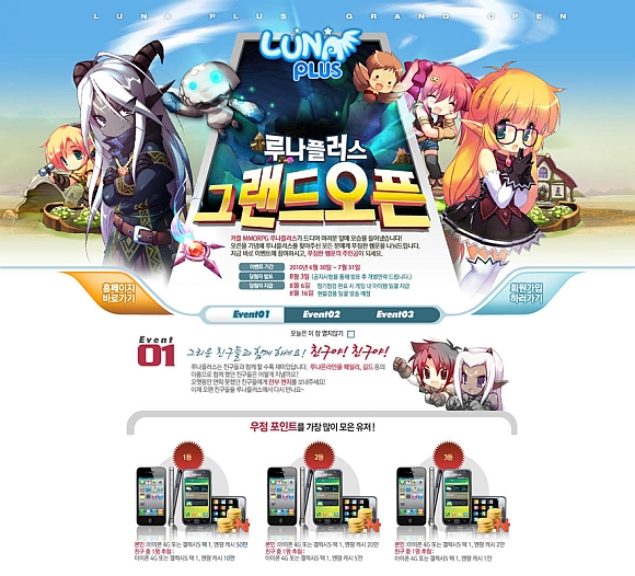 이번 그랜드 오픈 서비스를 기념해 ‘루나플러스’에서는 너무너무 갖고 싶은 ‘아이폰 4G’나 ‘갤럭시S’, ‘삼성 LCD’, ‘DSi’, ‘백화점 상품권’, ‘엔팡 캐시’ 등 풍성한 경품을 증정하는 3색 이벤트를 6월 30일부터 7월 31일까지 진행한다.