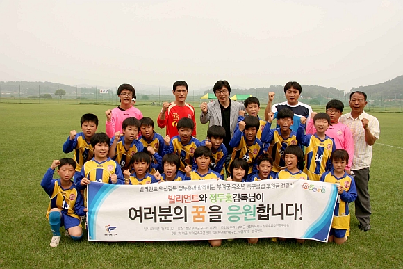 정두홍 감독이 후원하는 유소년 축구클럽은 지난 2008년 8월에 창단하여 초등학생 35여 명이 주축을 이룬 축구팀으로 충남 부여군의 많은 관심 속에서 내일의 태극전사를 목표로 힘차게 뛰고 있다.