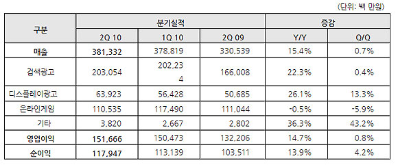 NHN(대표는 2010년도 2분기 매출액 3,813억원, 영업이익 1,517억원, 순이익 1,179억원을 기록했다고 30일 밝혔다. 이는 전년 동기 대비 매출액은 15.4%, 영업이익은 14.7% 성장한 수치다.