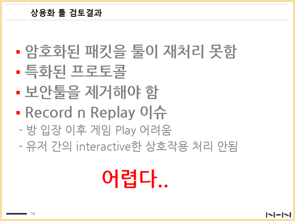 김 실장이 처음 시도해본 ‘게임테스트 자동화’는 외부 프로그램을 통한 서버 스트레스 테스트였다. 하지만 게임 서비스의 경우 고객 보안을 위해 부득이하게 보안툴을 통한 암호화 과정을 거치는 탓에, LoadRunner나 Venus Blue와 같은 외부 툴로는 테스트에 활용하려고 하는 패킷을 제대로 처리하지 못하는 문제가 관측되었다. 김 실장은 “처음에는 다른 회사에서 개발된 범용툴을 사용한 게임테스트 자동화를 시도했지만, 국내 게임의 다양한 보안툴과 유저 간의 상호작용을 최대한 가깝게 재현해야 하는 ‘게임 테스트’에는 적절하지 않았다”고 회고했다.