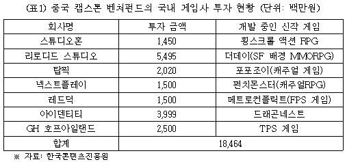 국회 문화체육관광방송통신위원회 소속 진성호 의원(한나라당, 서울 중랑乙)이 한국콘텐츠진흥원으로부터 제출받은 자료에 의하면 지난 2004년에 국내 게임개발사인 ‘액토즈 소프트’사를 9,165만 달러에 인수 한 중국의 주요 게임 유통사인 ‘샨다’가 최근에 우리나라에서 유망한 중견 게임개발사인 ‘아이덴티티 게임즈’를 9,500만달러에 인수하였고, 중국의 3대 유통사인 ‘텐센트’가 참여하는 투자펀드(캡스톤벤처펀드)에서도 국내 게임개발사 7곳에 184억을 투자하는 등 중국 자본이 우리나라 게임산업으로 유입되고 있는 것으로 확인되었다.