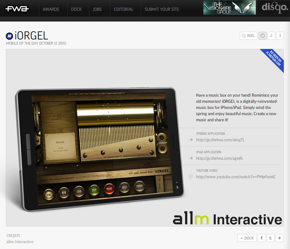 올엠 인터랙티브 사업부의 아이폰?아이패드 어플리케이션 iORGEL(아이오르골)이 세계적인 웹사이트 평가 기관 FWA의 `오늘의 모바일`(Mobile of The Day)` 어워드 10월 12일(화)자 수상작으로 선정되었다.