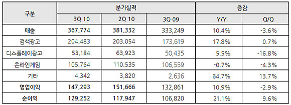 한편, 자회사를 포함한 NHN의 3분기 연결 실적은 4,086억 원을 기록하였으며, 영업이익은 1,541억 원, 순이익은 1,293억 원을 기록했다.