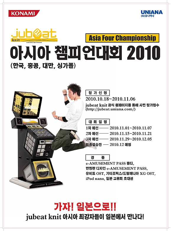 유니아나는 터치로 즐기는 리듬 게임 `유비트 니트`의 아시아 4개 지역 최강자를 선발하는 <유비트 니트 아시아 챔피언대회 2010>를 개최한다고 27일 밝혔다.