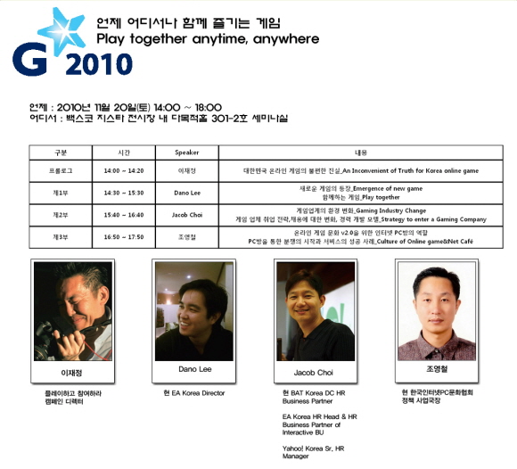 20일(토) 오후 2시부터 다목적홀 301-2호에서 개최되는 ‘행복한 게임 컨퍼런스’는 게임에 대한 다양한 주제를 가지고 세미나를 진행할 예정이다. 조영철 인문협 정책사업국장 등이 연사로 나서는 이번 세미나는 한국 게임 시장에 대한 진단은 물론 향후 게임 업계로의 진출을 원하는 이들에게 도움이 될 수 있는 취업 전략 등 다채로운 정보가 제공될 예정이다.